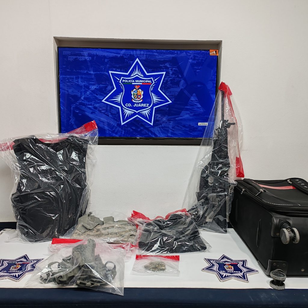 Durante la revisión, localizaron en el interior del automotor una maleta de color negro, de la cual sobresalía lo que aparentaba ser la punta de un arma larga, al inspeccionar el maletín, confirmaron que contenía un fusil de asalto calibre .223, con un cargador desabastecido, una bolsa de plástico con 13 cartuchos útiles del mismo calibre, un chaleco balístico en color negro, una funda para arma corta, un pasamontañas en color negro, así como un aditamento para chaleco porta cargadores.