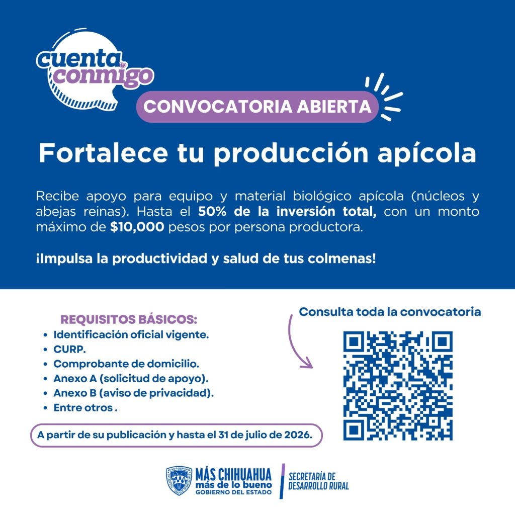 El Gobierno del Estado, a través de la Secretaría de Desarrollo Rural (SDR) informa a los apicultores chihuahuenses que ya se encuentra disponible el esquema de Apoyos para Equipamiento e Infraestructura Rural, del programa Cuenta Conmigo en el Campo.