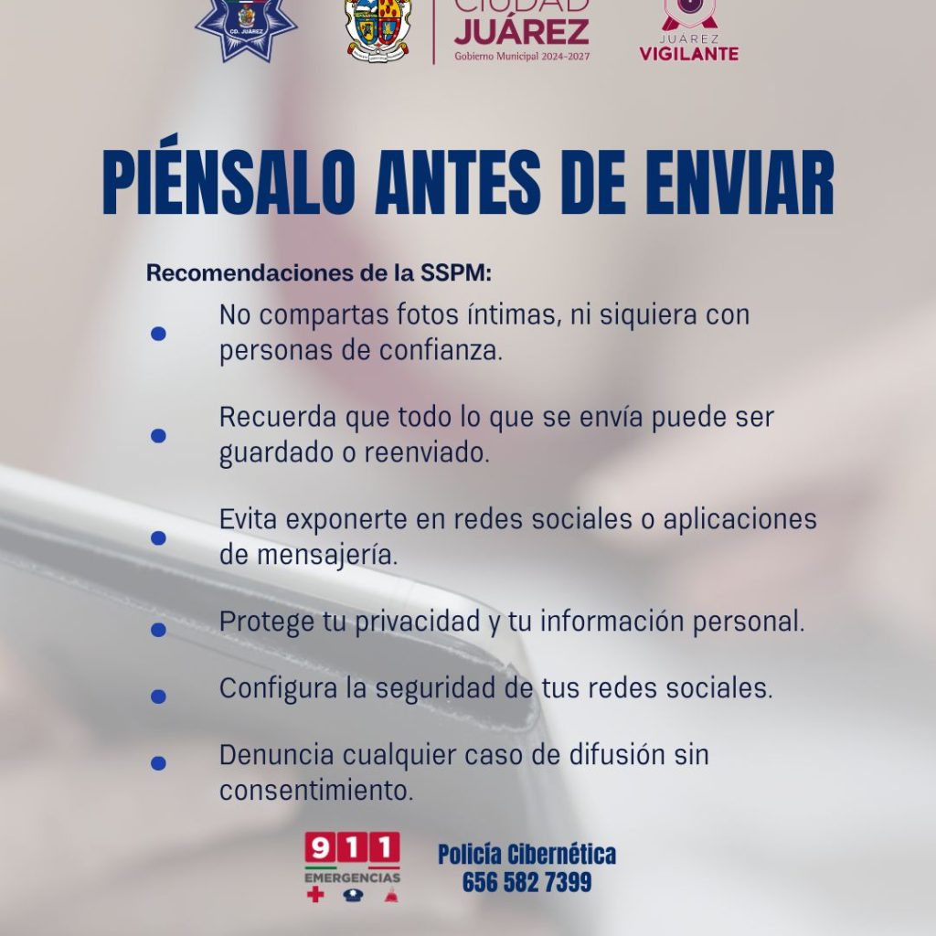 La Secretaría de Seguridad Pública Municipal (SSPM) envía un exhorto a la ciudadanía para evitar compartir contenido íntimo como fotografías a través de redes sociales o aplicaciones de mensajería. En la actualidad, el envío de imágenes puede parecer una acción cotidiana; sin embargo, este tipo de contenido puede ser difundido sin consentimiento y llegar a manos equivocadas, ya que con…