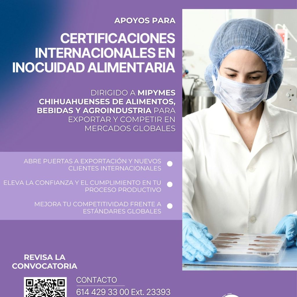 El Gobierno del Estado, a través de la Secretaría de Innovación y Desarrollo Económico (SIDE) convoca a micro, pequeñas y medianas empresas del sector agroindustrial a participar en el Programa de Apoyo a las MiPyMEs para las Certificaciones Internacionales en Inocuidad Alimentaria. Esta iniciativa tiene como propósito fortalecer la competitividad y el crecimiento de las empresas chihuahuenses, mediante el cumplimiento…